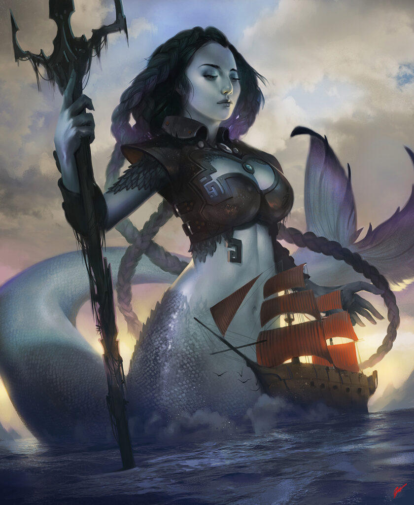 It wasn’t long after I returned from the water with some lunch later when we heard a great crash over the waves. We looked out over the ocean and there she was, this giant mermaid Sea Goddess. She had risen from the water next to our ship. The Dark Human Guy was impressed with her majesty, or it could have been her giant bosom or midriff, I can never tell what gets humans worked up. She towered over the ship like it was a toy, and then we heard cannon fire. Like, really bro? A giant, busty Sea Goddess comes over to your place for a visit, and all you can do is shoot at her? I mean, offering her a cool ale might have gotten you a lot farther, man. Uncool. Well, it didn’t take long for her to bring her trident down with one swoop and crack ship in two. Then she sunk back into the water without a word.